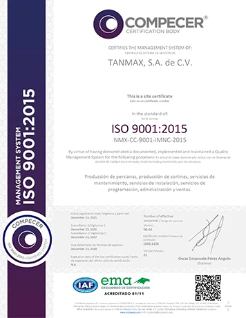 TANMAX, S.A. de C.V., a través de su marca TecnoShades®, garantiza la calidad de los productos suministrados